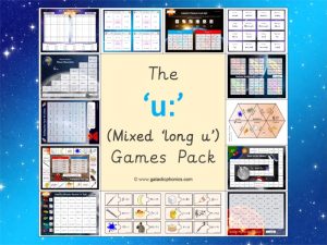 A set of 25 double-sided long vowel phonics flashcards. Print, cut, fold and laminate. Has the grapheme on one side and a picture, caption and set of words on the other.