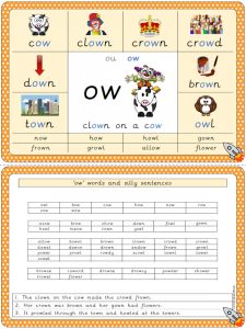 Double-sided poster with a visual clue, strapline, list of ‘ow’ words and a few silly sentences.