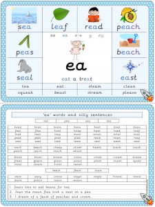 Double-sided poster with a visual clue, strapline, list of ‘ea’ words and a few silly sentences.