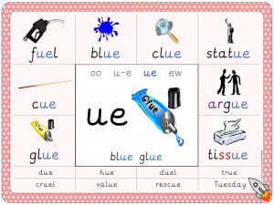 ‘ue’ worksheets, games, flashcards, PowerPoints and other phonics resources.