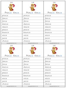Six double-sided ‘-ce’ word flashcards. Print, cut along the horizontal lines, fold and laminate.