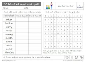 Free 'o' (as in 'brother') phonics worksheets, games and resources