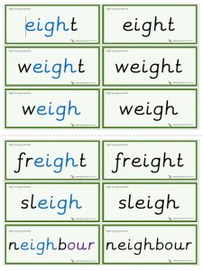 Six double-sided ‘eigh’ word flashcards. Print, cut along the horizontal lines, fold and laminate.
