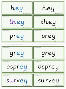 Six double-sided ‘ey’ (long a) word flashcards. Print, cut along the horizontal lines, fold and laminate.