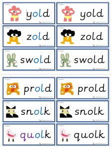 Six double-sided ‘ol’ (long o) alien/nonsense word cards. Print, cut along the horizontal lines, fold and laminate.