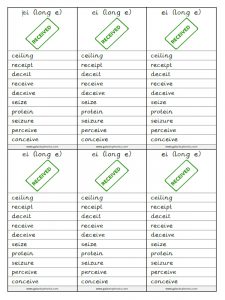 A convenient set of spelling lists containing ‘ei’ (long e) words. Great for sticking into spelling books or sending home to learn for homework.