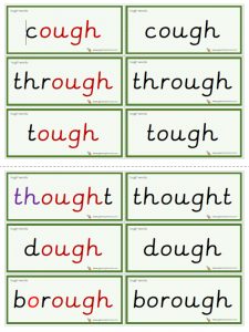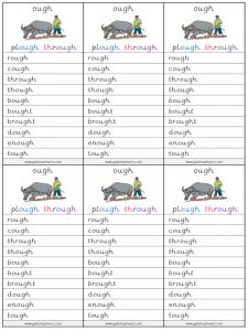 Six double-sided ‘ough’ word flashcards. Print, cut along the horizontal lines, fold and laminate.