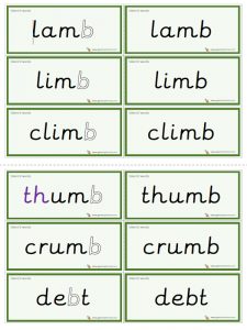 Six double-sided ‘silent b’ word flashcards. Print, cut along the horizontal lines, fold and laminate.