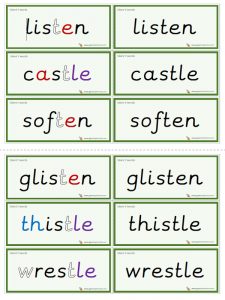 Six double-sided ‘silent t’ word flashcards. Print, cut along the horizontal lines, fold and laminate.