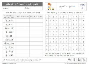 Silent u worksheet including adding sound buttons, a look/cover/write/check section and a simple wordsearch.